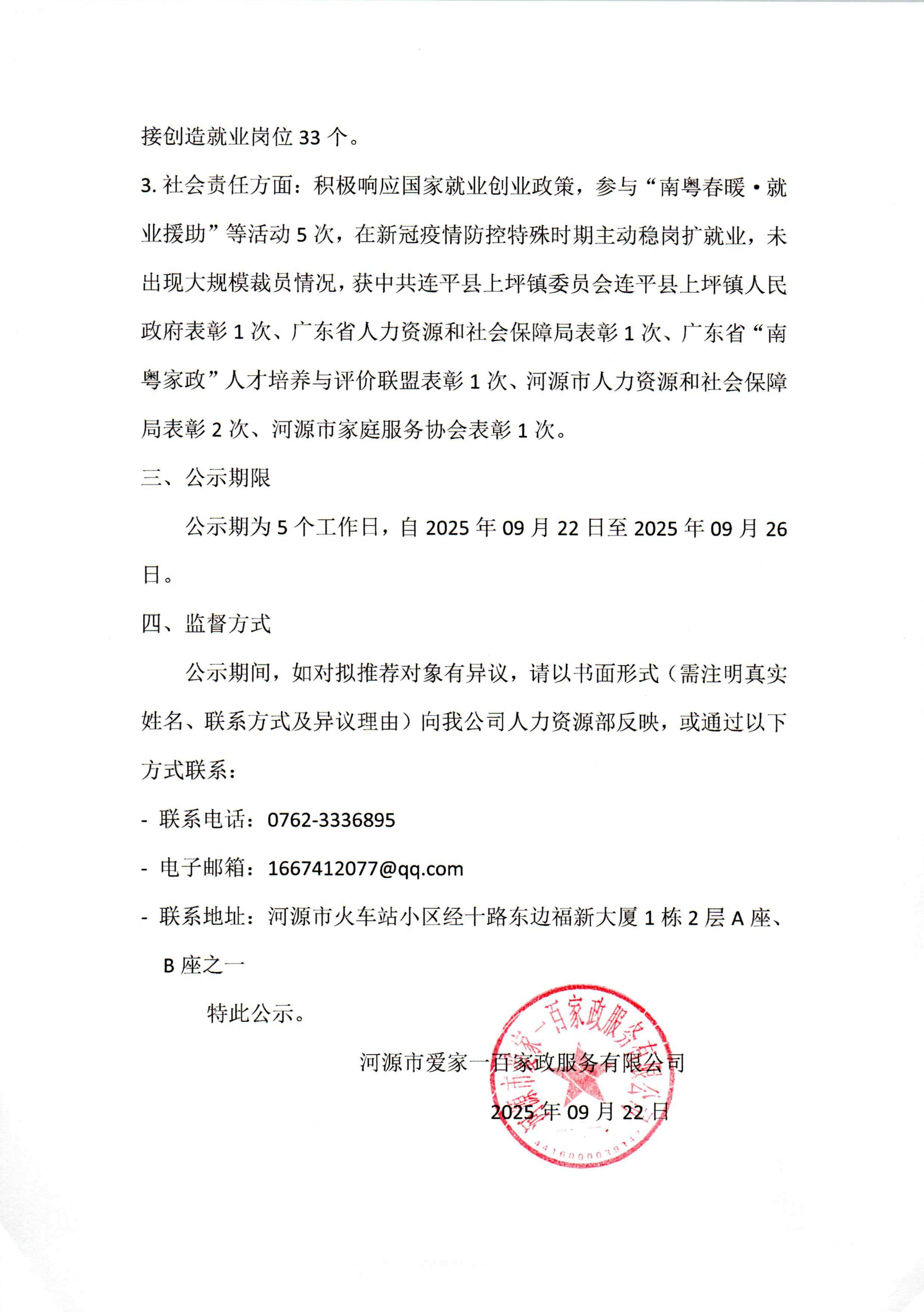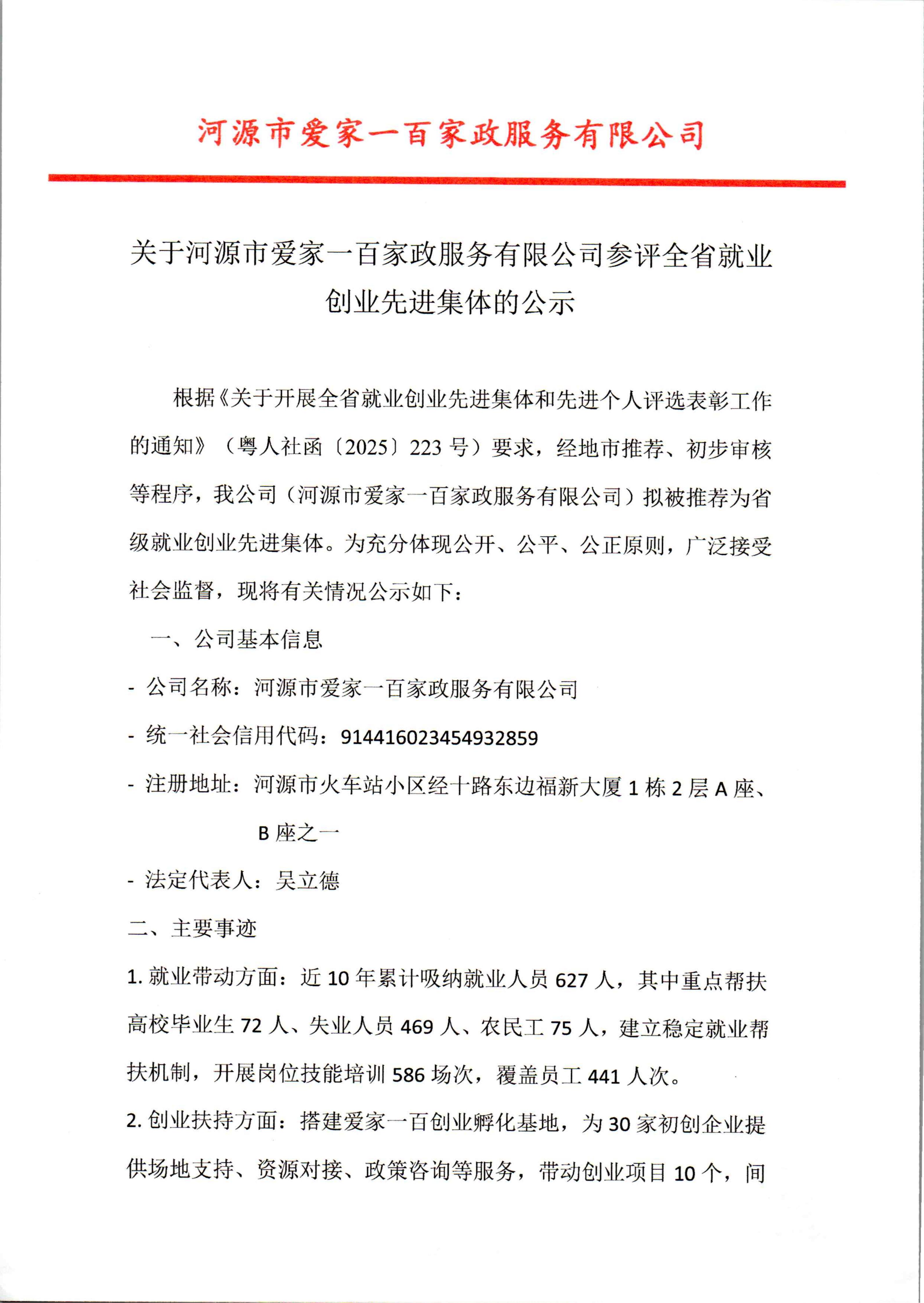 關于河源市愛家一百家政服務有限公司參評全省就業創業先進集體的公示